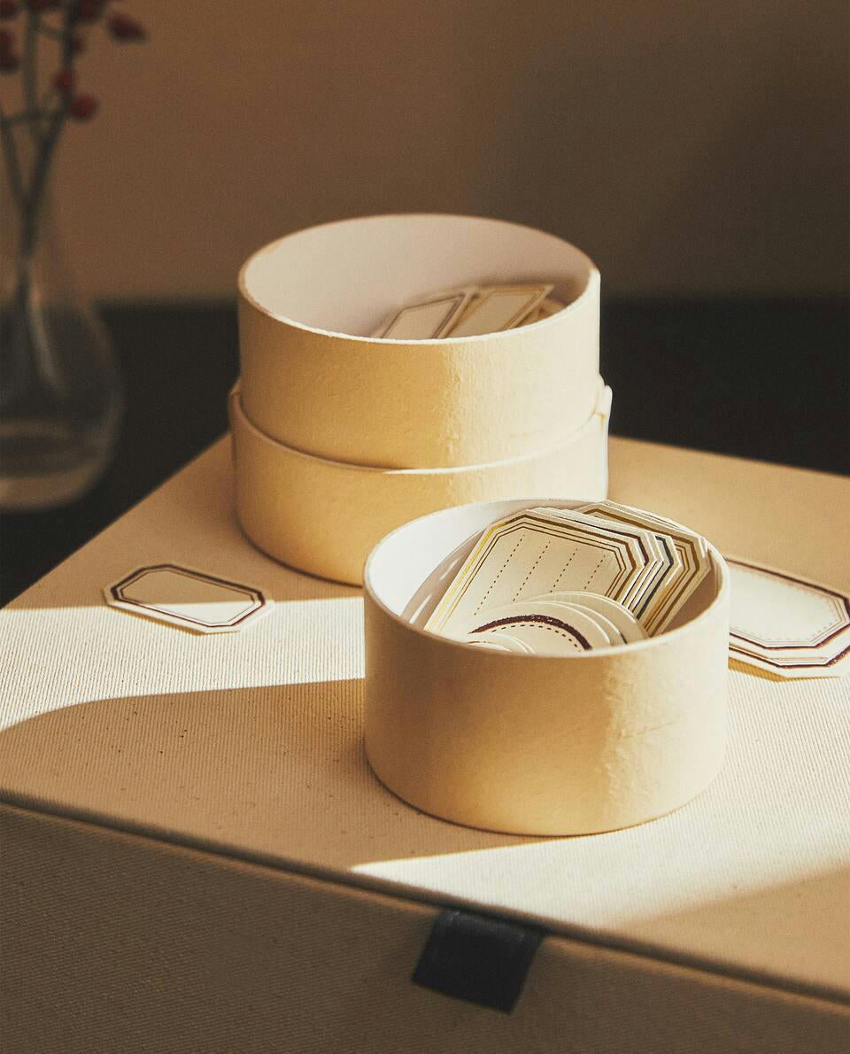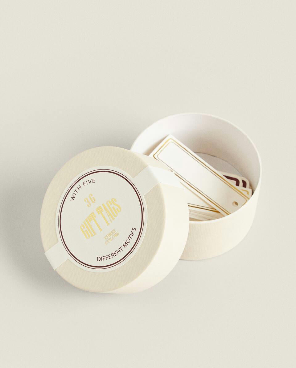 Round box with a lid, featuring paper labels for Christmas gifts.Pack of 20.