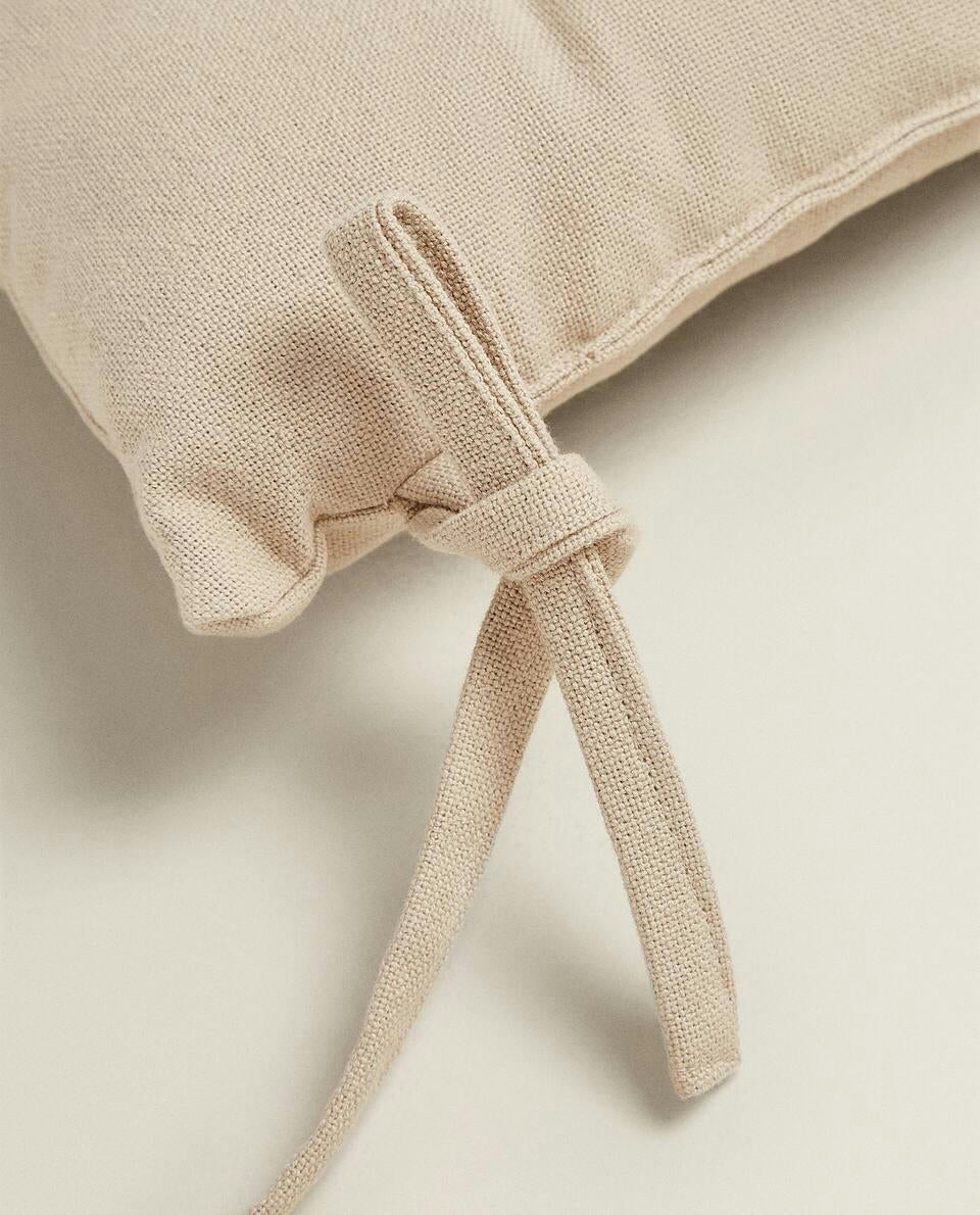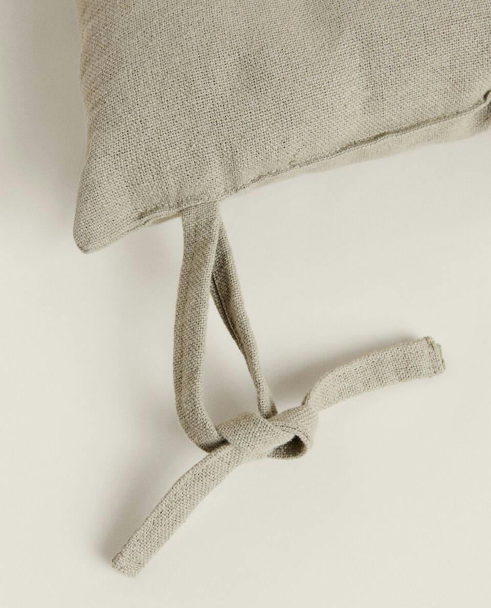 Quilted cushion for a chair base, includes two ties for tying to the chair.
